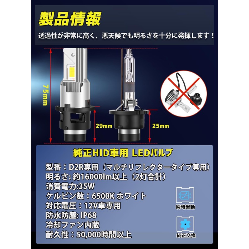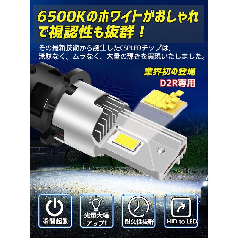• Genuine Product: The D2R LED bulb has a built-in noise cancellation to prevent electromagnetic interference. Car radio with no noise or interference, so you can drive with confidence. A masterpiece with stable performance. 2 year warranty so you don't have to worry about the durability of the product. So you can buy with confidence. Product Information: D2R LED bulbs/Kelvin quantity: 6500K white; Power consumption: 35W (one side) / 12V car; Life: Approx. 50,000 hours or more. *For after-sales service, please contact us directly through your order. We will provide you a satisfactory solution