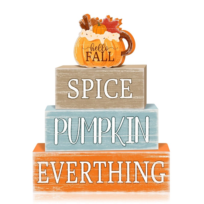 Britimes 4 Pcs Fall Pumpkin Table Decor Autumn Tiered Tray Decorations Set Spice Pumpkin Everything Stack Block Signs Gift Rustic Farmhouse Tabletop Decor for Table & Home Office