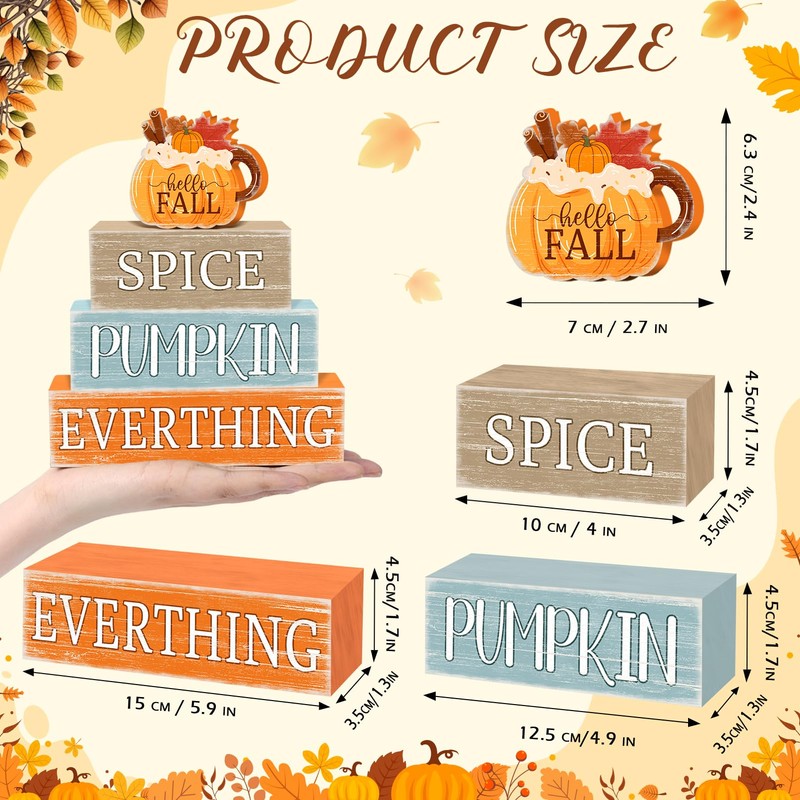 • Perfectly Sized for Any Display: Includes three wood blocks (4” x 1.3” x 1.7”, 5” x 1.3” x 1.7”, and 6” x 1.3” x 1.7”) with a pumpkin drink topper. Ideal for fall coffee bars, Thanksgiving tiered trays, or cozy farmhouse centerpieces.