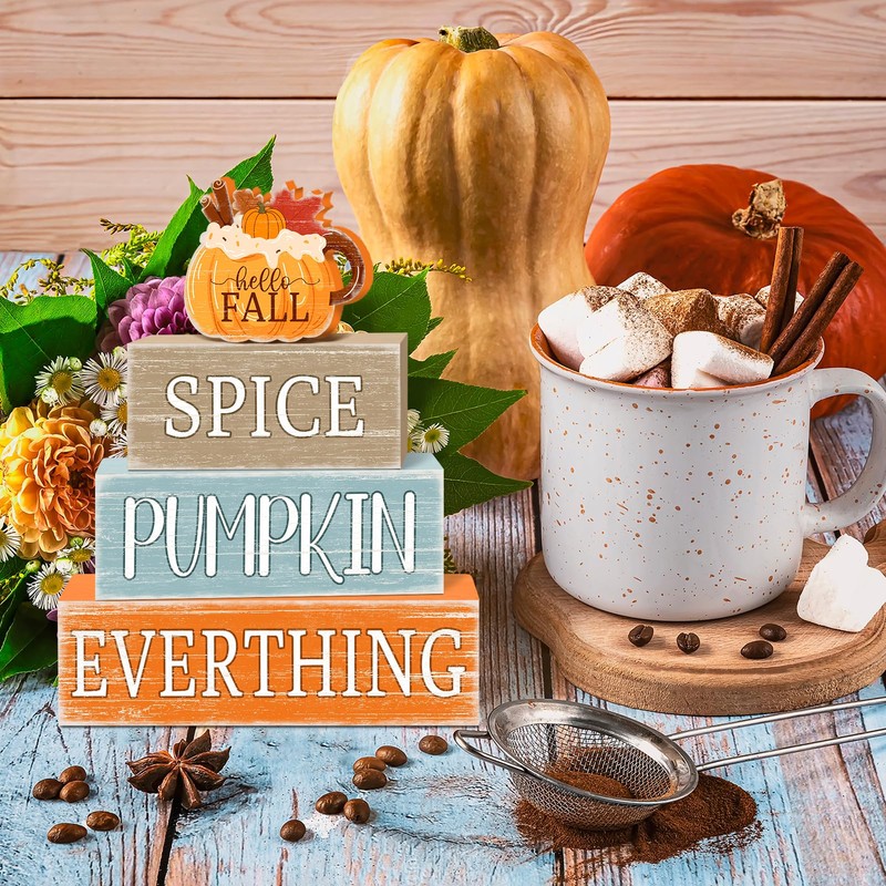 • Rustic Pumpkin Spice Fall Decor: This wooden tiered tray decor set showcases a cute pumpkin mug topper with whipped cream, fall leaves, and cinnamon sticks, paired with phrases like “Spice,” “Pumpkin,” and “Everything,” celebrating all things autumn.
