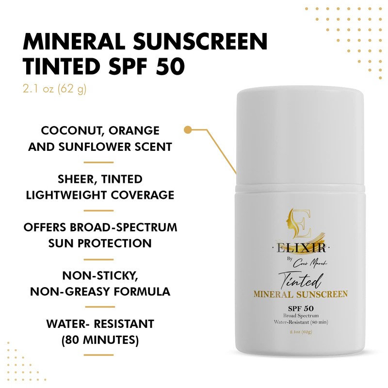Elixir by Coco March Broad Spectrum Mineral Tinted Sunscreen SPF 50 Water-Resistant-80 min, Hydrates and Enhances Skin, Adults and Children- 2.1 oz 59 g