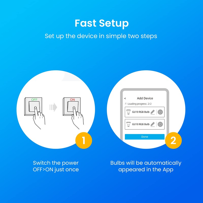 - 【Easy Setup】BroadLink FastCon technology via connection, just power up the GU10 light bulbs and wait it to be discovered in BroadLink FastCon App. Forget tons of steps to set up wifi devices in the past. Batch pairing will allow you to add up to 90 devices at the same time within 1s, no need to waste your time to set up devices one by one.