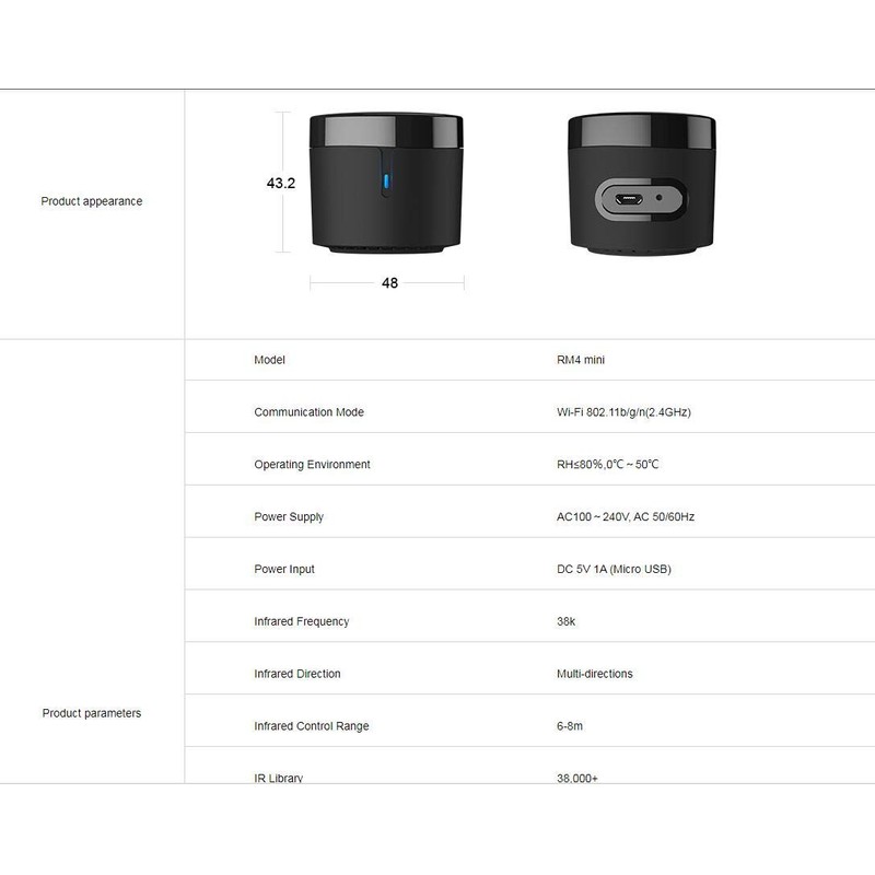 - RM4 Mini IR Universal Remote ----- Support 50,000+ IR controlled devices, including TV, STB, DVD, air conditioning, audio, PVR, etc. * Large IR database: cover 98% IR remote control function, automatically update in the cloud. * Learning function: learn your remote control when the device model is not available. * Smaller but smart: create multiple timers and scenes as needed.