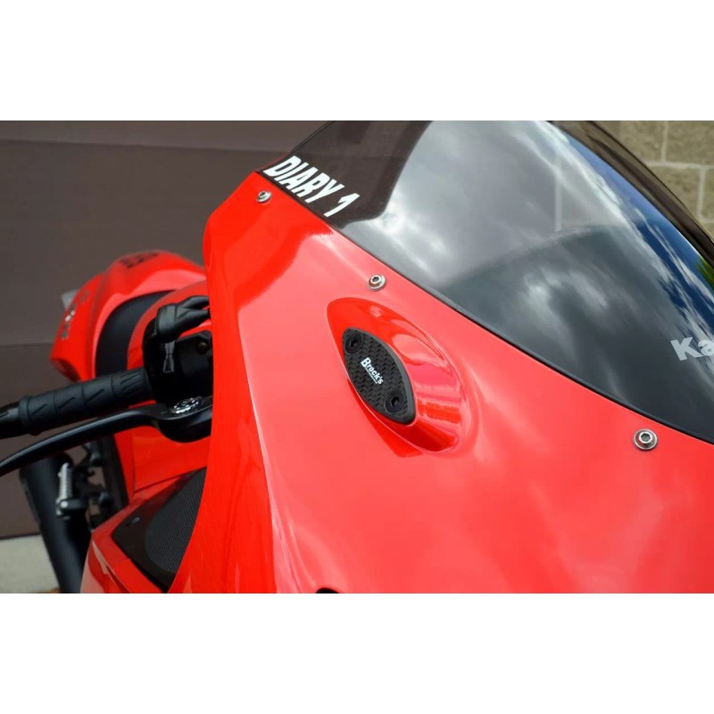Designed to replace the stock mirrors for track use, these block offs are for the Kawasaki ZX-14/R. Made from 27 layers of carbon fiber with a gloss finish, they come with black anodized 7075 aluminum screws and weigh only 0.8 ounces.
