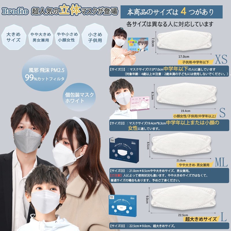 - 【基本情報】本商品のサイズは 5 つあり、各サイズは異なる人に対応しています。【サイズ①】(立体マスク)17.0cm*7.0cm、中学年以下の子供に適しています。(※注意:2歳未満の子どもに使用させないでください。)【サイズ②】(立体マスク)19.4cm*8.3cm、中学年以上の子どもまたは小顔の女性に適しています。【サイズ③】(3Dマスク)約115mm*140mm(折り畳み状態)、小さめサイズ、小顔女性用。【サイズ④】(立体マスク)21.0cm*8.5cm、やや大きめサイズ。【サイズ⑤】(立体マスク)22.5cm*9.0cm、超大きめサイズ。