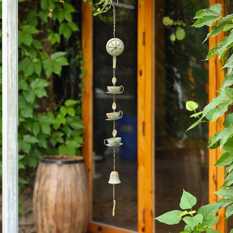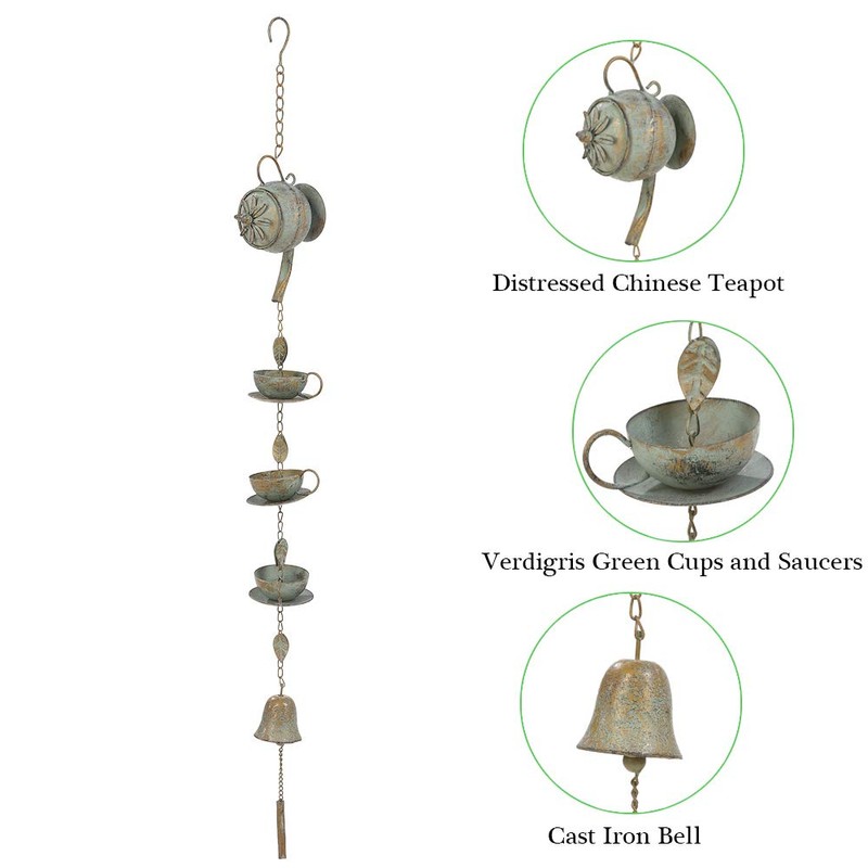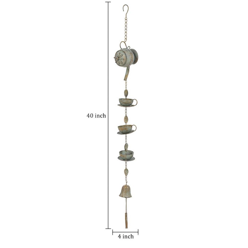 Brogan 40" H Teapot & Cups Rain Chain with Bell Chime Hanging, Outdoor Patio Garden Yard Decoration(Distressed Verdigris)