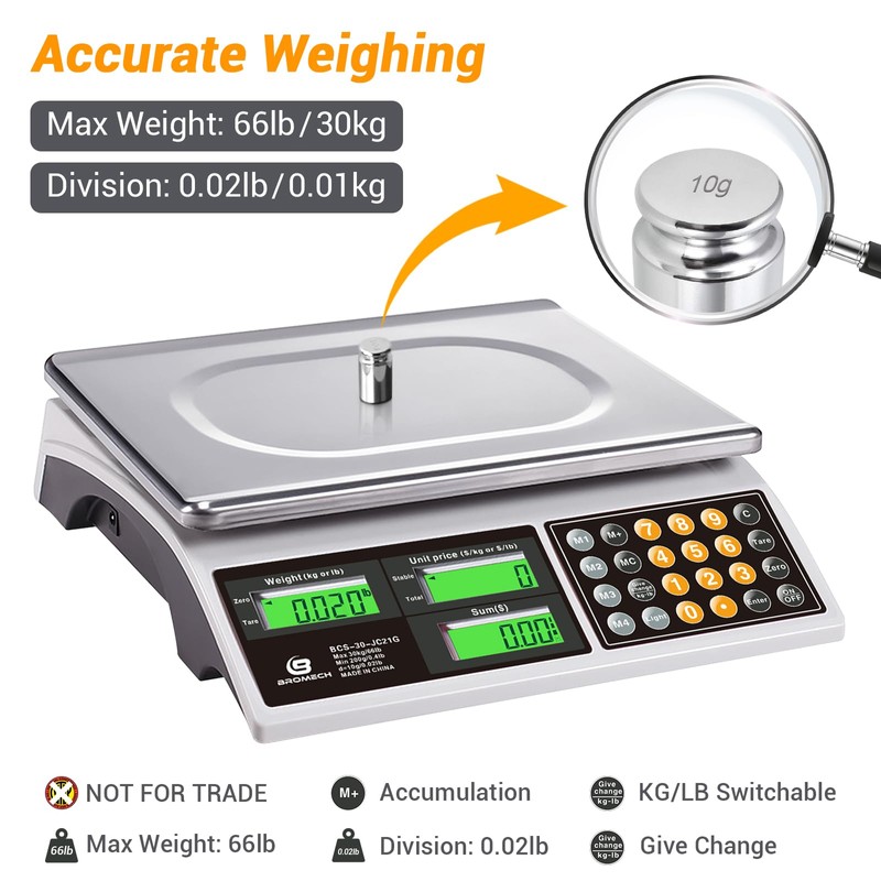 BROMECH Price Computing Scale, 66lb Digital Commercial Food Meat Produce Weighing Scale with Green Backlight LCD for Farmers Market, Retail Outlets, Dry Battery Powered, Not for Trade