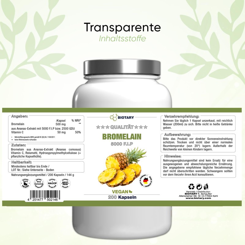 - Bromelain capsules: you will receive 200 capsules from Biotary and a high product quality at an absolute top – price – performance ratio.