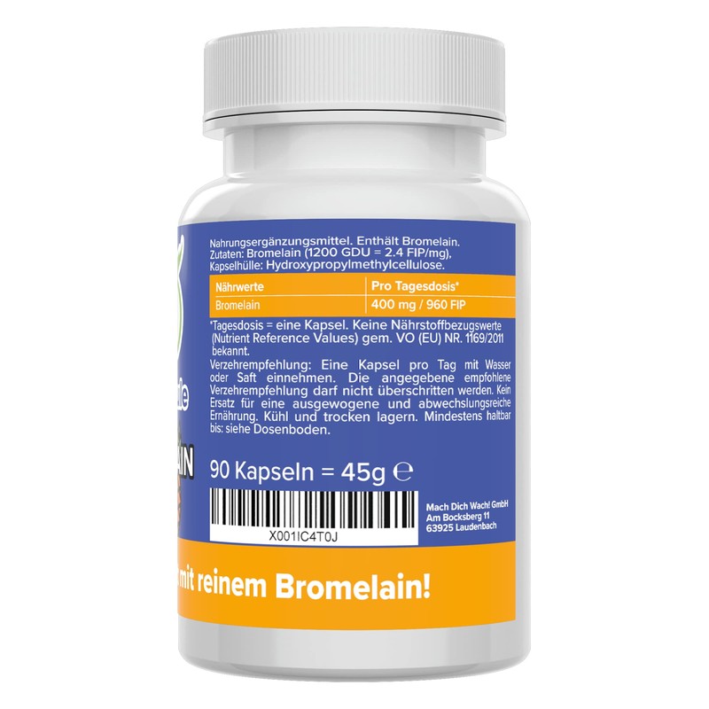 - High dose and quick effect - Our bromelain capsules contain 400 mg / 960 F.I.P. pure bromelain. The onset of action is quick and effective. Due to their natural composition, the Bromelain capsules have an exceptionally good compatibility and thus protect your stomach. One tin contains 90 capsules. The capsules can be opened and the powder dissolved in water or juice.