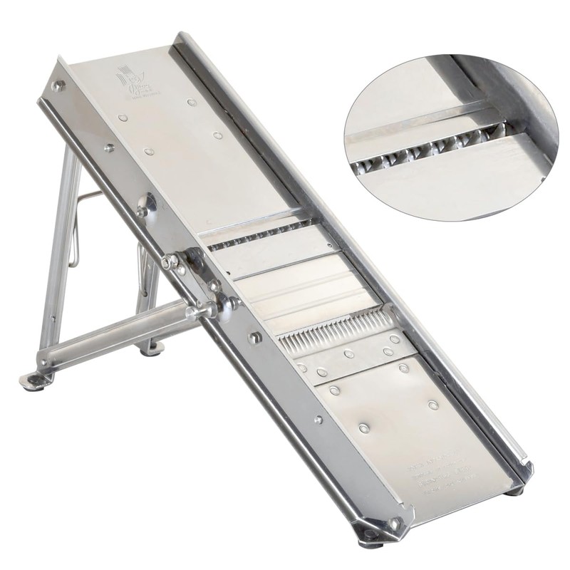 - Corrugated and straight edge blades. 2 julienne blades (1/8" and 3/8").