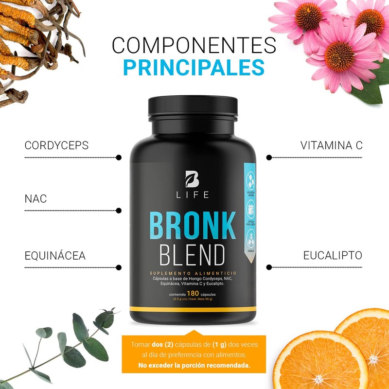 - Bronk Blend es un suplemento alimenticio con 180 cápsulas a base de Hongo Cordyceps, NCA, Flor de Echinacea, Vitamina C y Eucalipto.