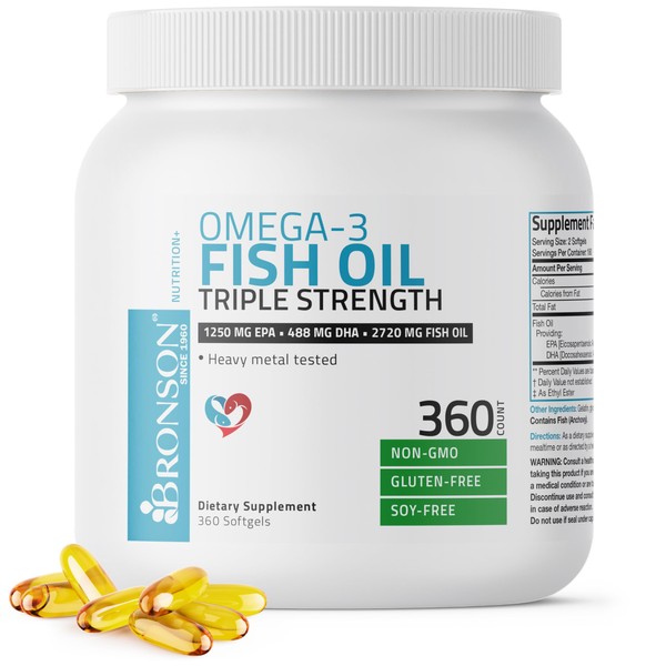 Bronson Omega 3 Fish Oil Triple Strength 2720 mg, High EPA 1250 mg DHA 488 mg, Non-GMO Heavy Metal Tested, 360 Softgels