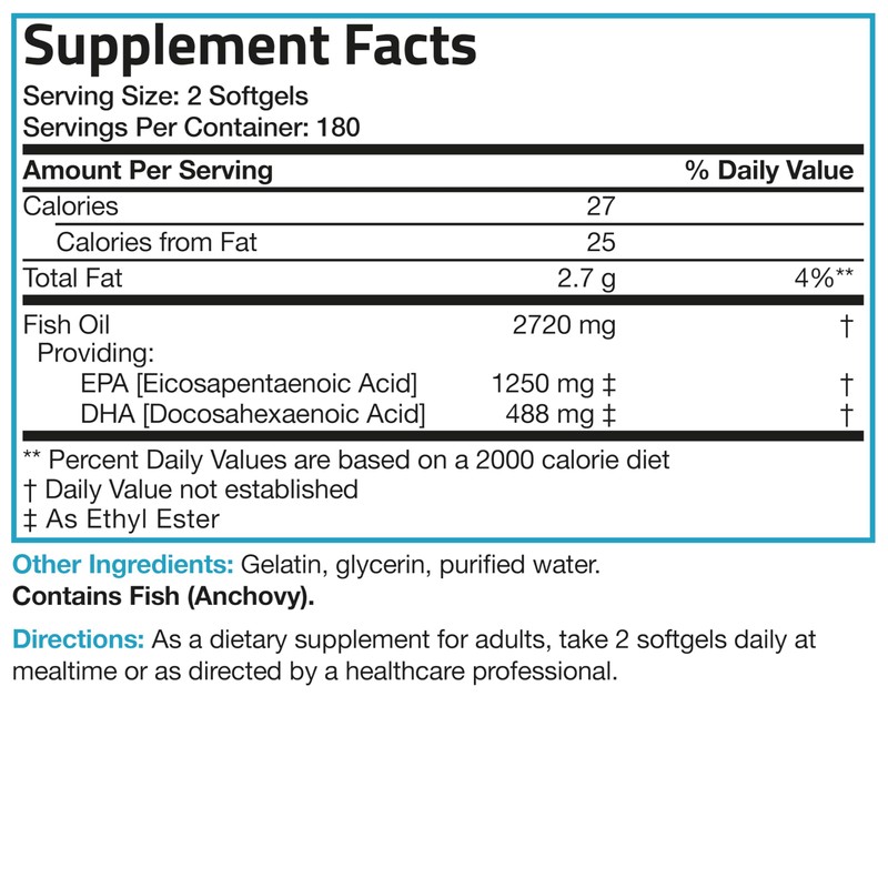Bronson Fish Oil Triple Strength provides essential Omega-3 fatty acids EPA and DHA. Our high potency formula provides 1250 MG of EPA and 488 MG of DHA per serving (2 Softgels). Bronson Omega-3 Fish Oil Triple Strength helps to support heart health, brain function, vision, and joint health.* Laboratory tested for Heavy Metals, GMOs, Gluten, and Soy, our Omega-3 Triple Strength is consistently verified every batch for quality and final product potency.