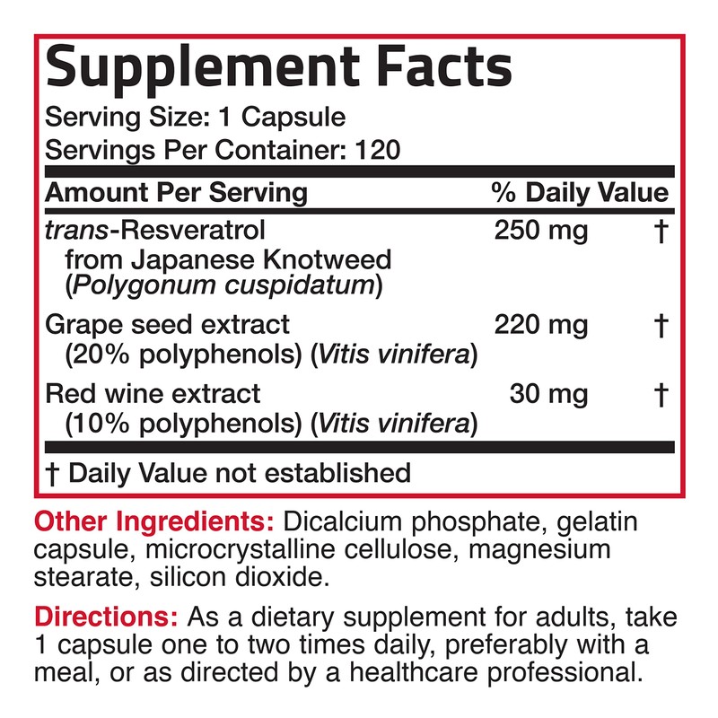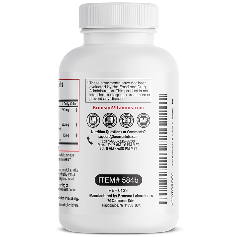 Resveratrol is a powerful polyphenol that is found in specific plants, berries, red wine, and red grapes. Research has shown that Resveratrol can help to support healthy aging, cellular health and stress response through its beneficial properties.* Bronson Resveratrol Complex 500 MG provides 250 mg of trans-Resveratrol that is naturally derived from the Japanese Knotweed plant. Additionally, Resveratrol Complex includes added polyphenol support through Grape Seed and Red Wine Extracts. Free of GMOs, Gluten and Soy, Bronson Resveratrol Complex 500 MG is carefully manufactured by trained professionals in our state-of-the-art facility that is located in Hauppauge, New York.