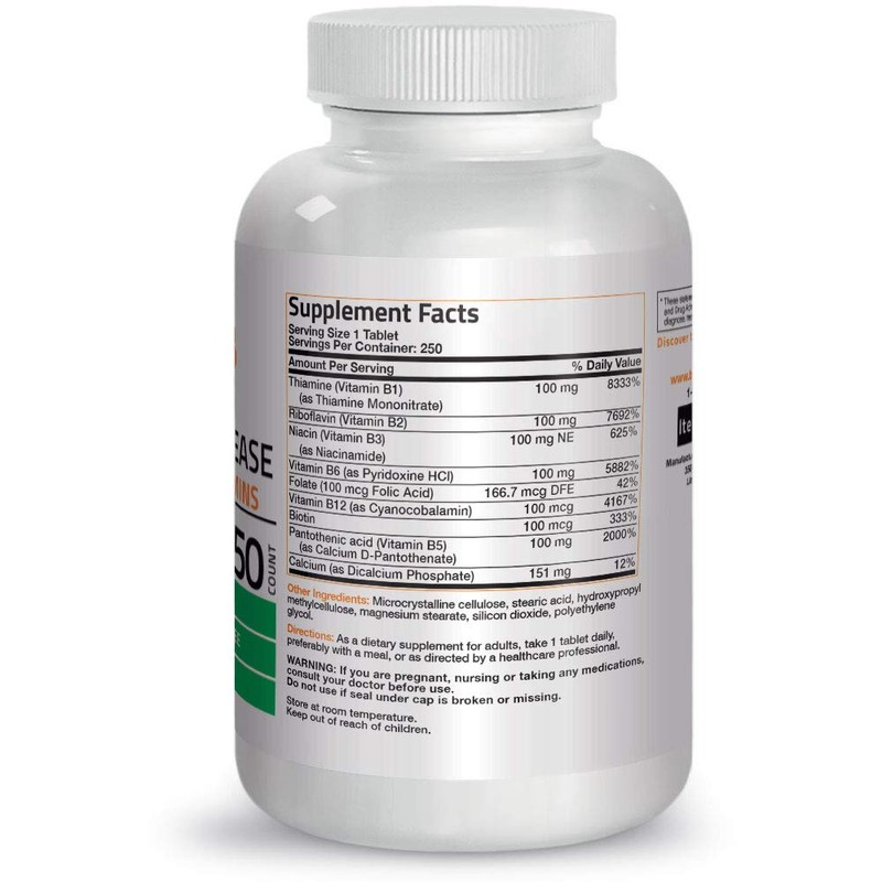 Bronson Vitamin B 100 Complex High Potency Sustained Release (Vitamin B1, B2, B3, B6, B9 - Folic Acid, B12), 250 Tablets