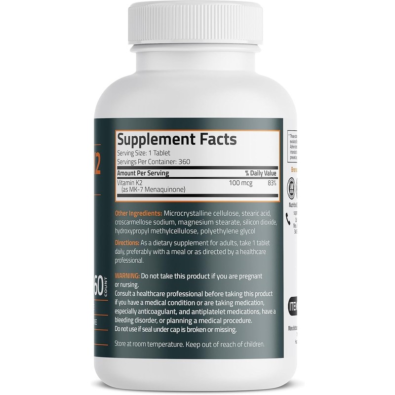 • High Quality & Great Value: Bronson Basics Vitamin K provides 100 MCG of premium K2 as MK-7 per tablet in a 1 year supply bottle. We strive to support your good health and well-being through high quality supplements at the best value.
