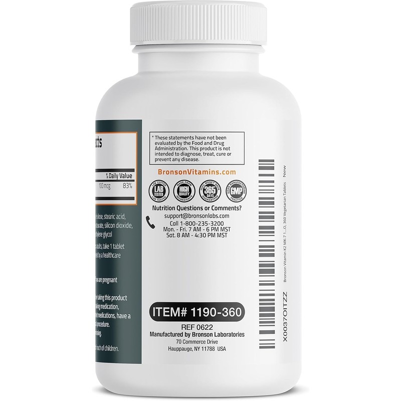 Bronson Basics Vitamin K2 MK-7 100 MCG is in-house laboratory tested and free of GMOs, Gluten and Soy. Our Vitamin K2 as MK-7 is carefully manufactured by trained professionals in our state-of-the-art facility that is located in Hauppauge, New York.