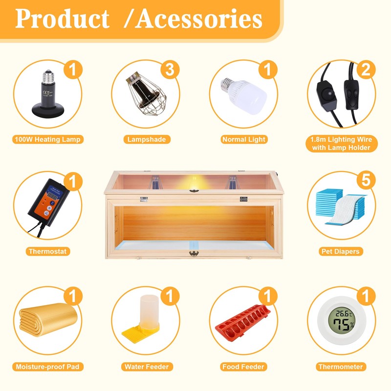 - Complete Kit: You will receive everything necessary for effective chick rearing, including one brooder box, one feeding tray, one waterer, one screwdriver, one dimmer switch, one ceramic lamp, one solar lamp, and five pet diapers.