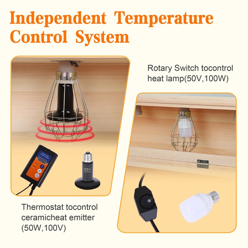 - Rapid Heating: Our brooder box heats up in just 3 seconds! The combination of a ceramic lamp and a heat lamp ensures optimal hatching temperatures, while the stepless knob allows you to adjust brightness and maintain a temperature range of 0 to 120°F.