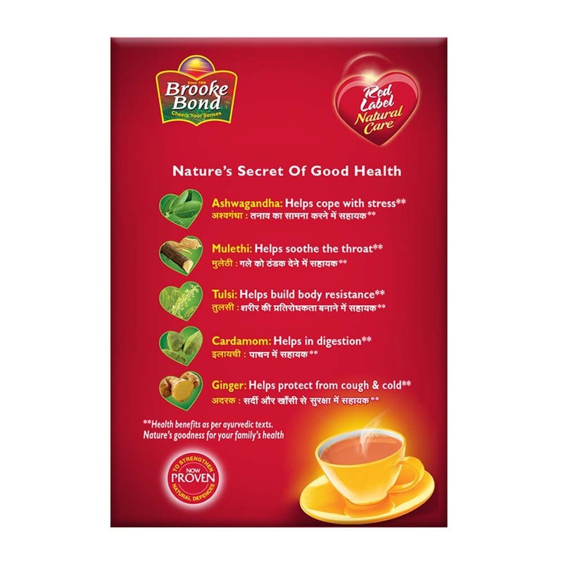 For over 140 years, Brook Bond’s experts have blended the best teas to create your perfect cup of tea. RED LABEL NATURAL CARE along with black tea has a mix of 5 Ayurvedic ingredients like Tulsi, Ashwagandha, Mulethi, Ginger and Cardamom that are proven to improve immunity and help you fall ill less often. Nature’s Secret of Good Health Ashwagandha : Helps cope with stress Mulethi : Helps soothe the throat Tulsi : Helps build body resistance Cardamom : Helps in digestion Ginger : Helps protect from cough & cold