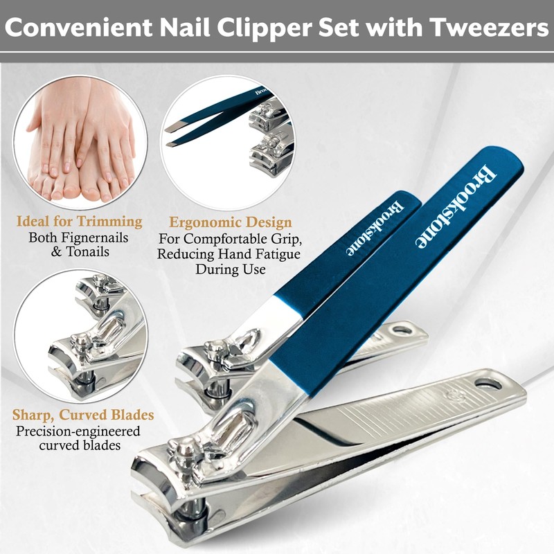 Brookstone Nail Clippers Set - Premium Stainless Steel Nail Clipper and Nail Cutter with Rubberized Non-Slip Grip, Includes Case and Tweezer, Two Nail Clippers for Precision Grooming (Navy)