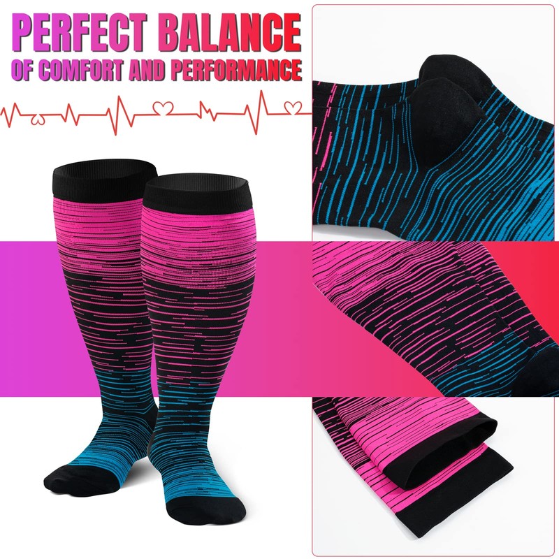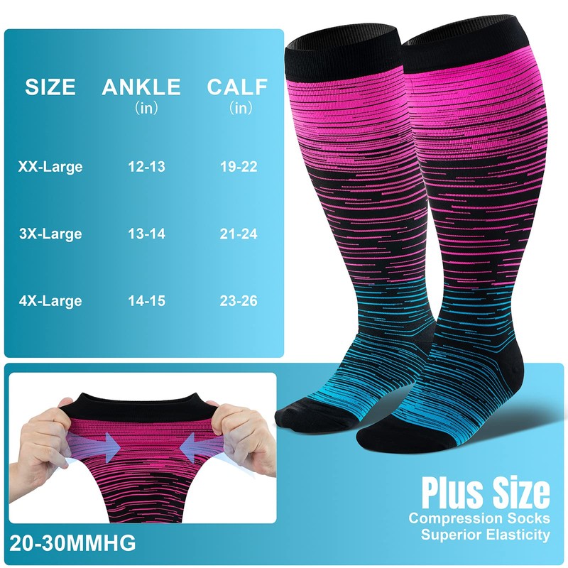 - Plus size compression socks wide calf:Suitable for compression socks with wide calf sizes, our compression socks for women plus size are designed specifically for women and men with large and wide calf . They are also made of durable fabric, providing a comfortable compression strength compared to ordinary sizes. The compression strength of large sizes can also bring you a more lasting compression treatment effect,you can wear it everday!