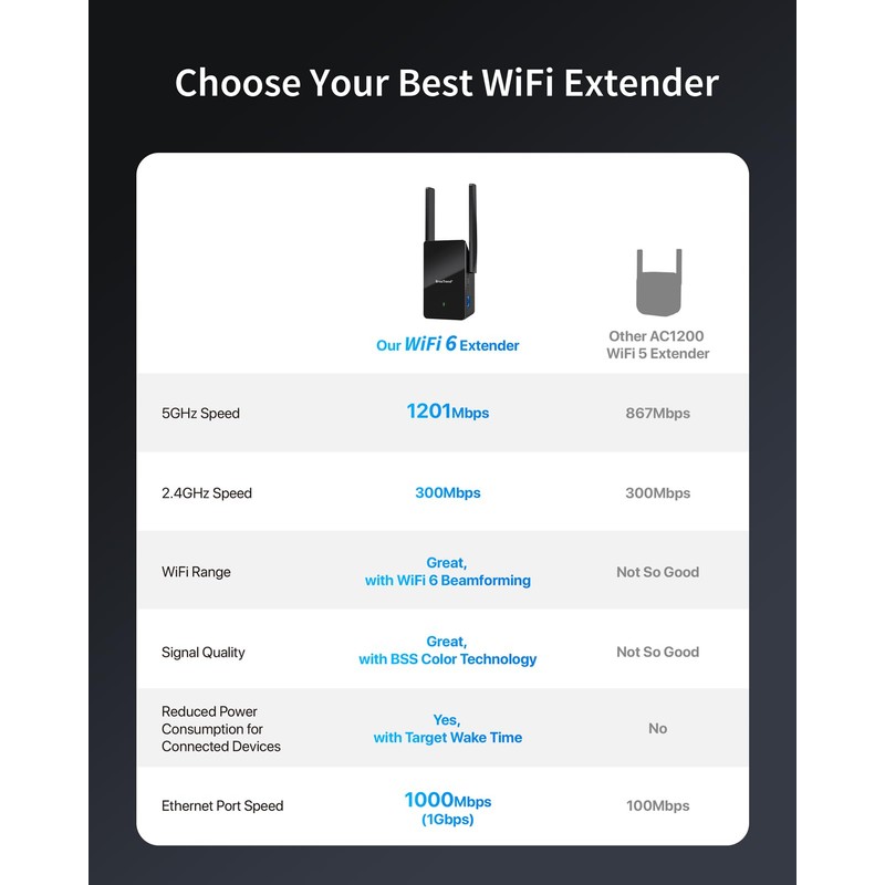- Superior WiFi Connection: Experience enhanced signal strength and quality with this WiFi 6 booster, thanks to BSS Color and Beamforming tech. Target Wake Time (TWT) tech extends battery life for your connected devices. These features make it an ideal choice compared to previous standard WiFi extenders signal booster for home