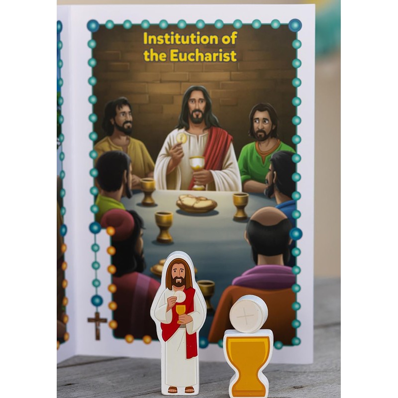 - Two, laminated, accordion-style backdrops featuring all twenty Mysteries of the Rosary allow your children to follow along and create a beautiful and prayerful scene for guided play.