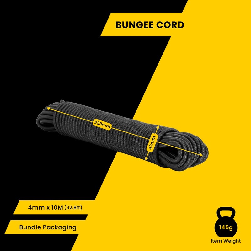 - 【Specifications & Packing】Our shock cords are available with different lengths, colours and thicknesses so that you need to choose the most appropriate one for your project. For this bungee cord, it comes in a size of 4mm x 10m, and is black. Bundle packaging makes it compact and ideal for carry in the workshop.