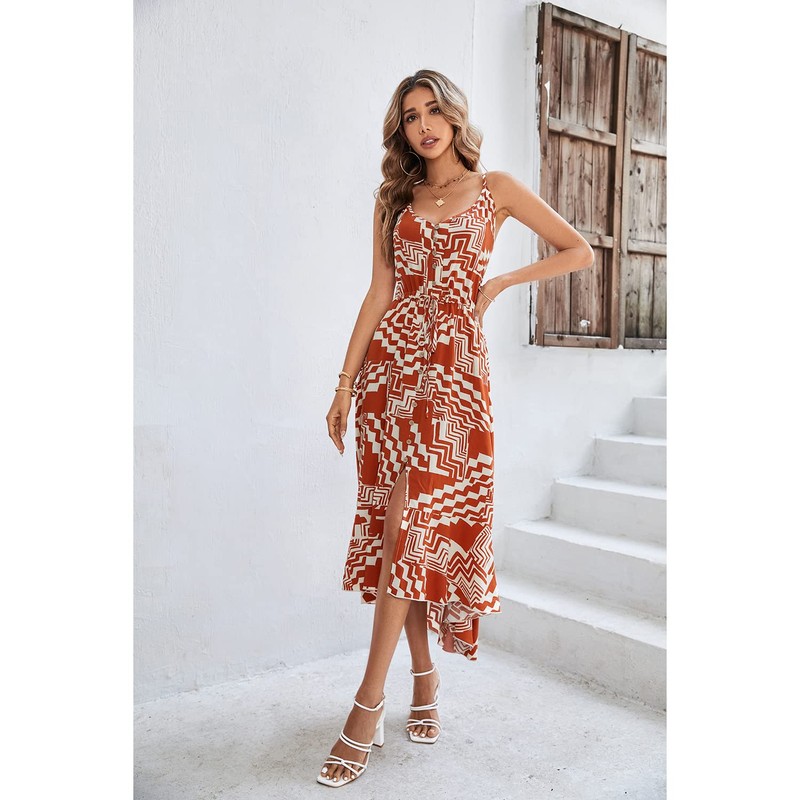 BROVAVE Women's 2025 Summer Casual Boho Sundress Polka Dot Spaghetti Strap V Neck Flowy Midi Dresses(008 Orange Boho, Small)