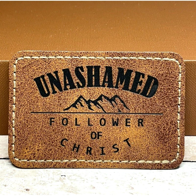 Brown Leatherette UNASHAMED Follower of Christ Bible Patch Iron on Adhesive