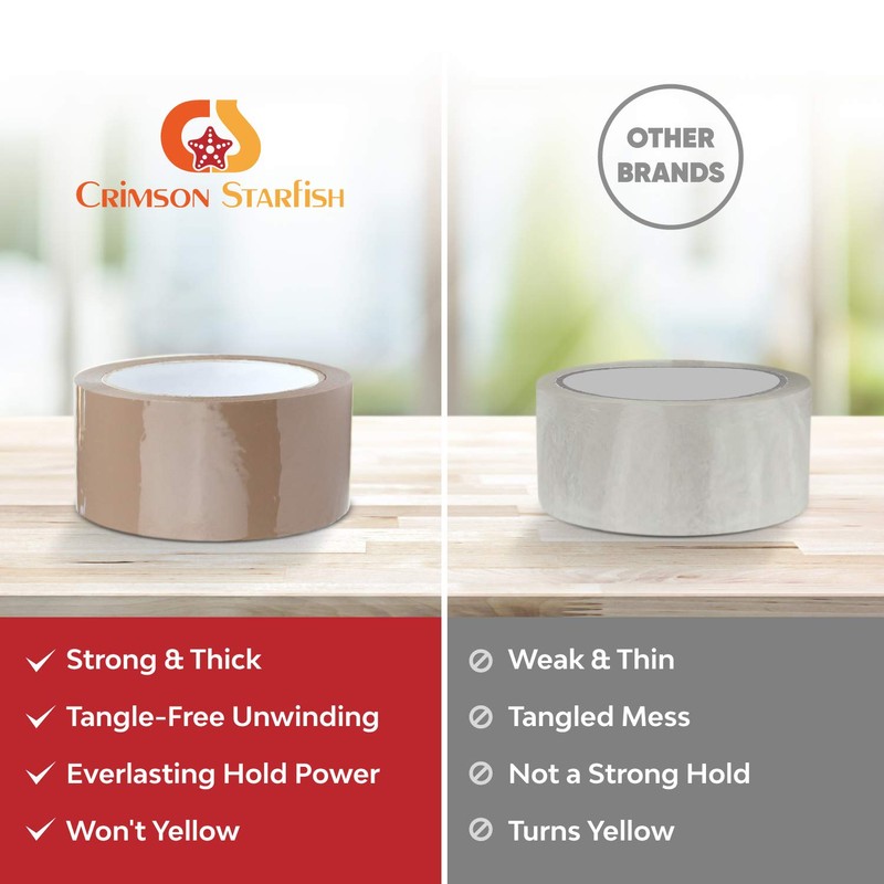 • UNMATCHED VALUE: For unmatched value and long-lasting use, Crimson Starfish present our brown packaging tape handily equipped with a dispenser. Rest easy knowing our paper tape will remain firmly in place and hold up under pressure. Coming with six rolls for fabulous value, opt for our brown package tape that offers effective sealing.