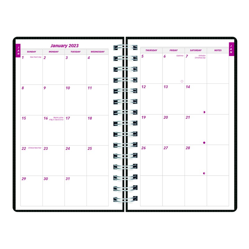 - Contains 2023 and 2024 year planners, tear-off corners, holidays, phases of the moon, a ruled notes section, personal information, four-year list of important dates, metric, weight and temperature conversion, interest table, telephone and address section