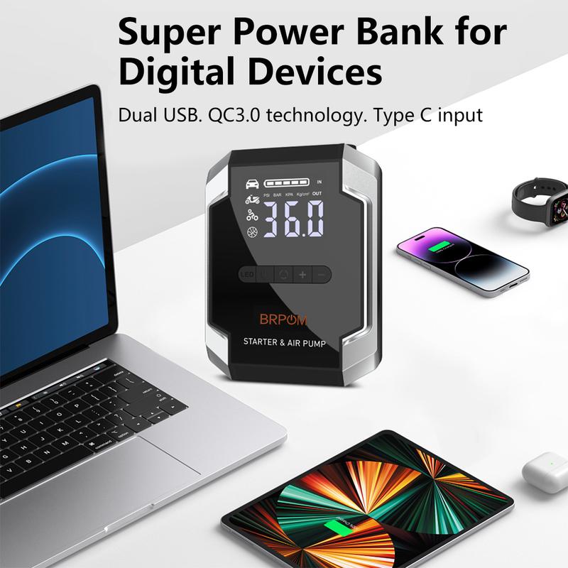 BRPOM 8500A Portable Car JumpStarter with Air Compressor (ALL Gas, 10.0L Diesel) 150PSI WithTire Inflator, 12V Car Battery JumpPower With LED Light