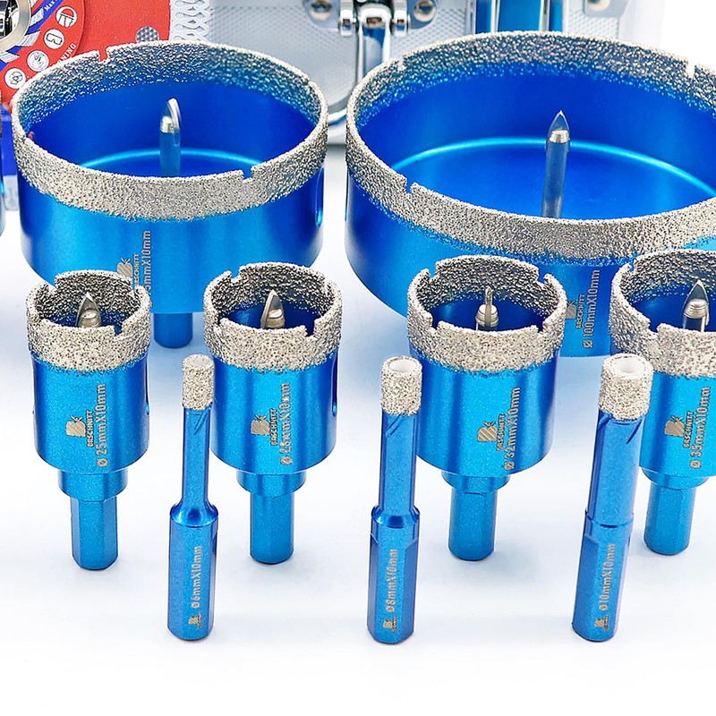 - ·Size:Includes Drill and Pilot Bits and Chamfer bit&Blade,Drill Diameter:6/8/10/20/25/28/32/35/45/50/75/100MMCutting Depth:30mm,Diamond Height:10 mm, Total Length:65 mm,Triangular shank, #40/45 Diamond Grit