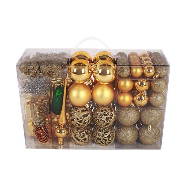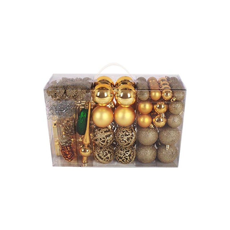 BRUBAKER 101 Pack Assorted Christmas Ball Ornaments - Shatterproof - with Green Pickle and Tree Topper - Designed in Germany - Golden