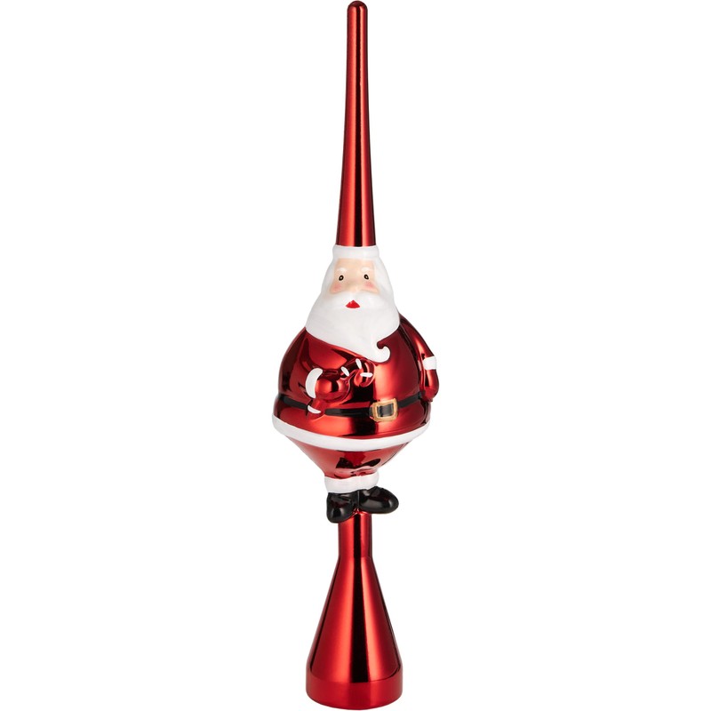 - Design: shiny Christmas tree topper in the shape of a thick Santa with candy cane.