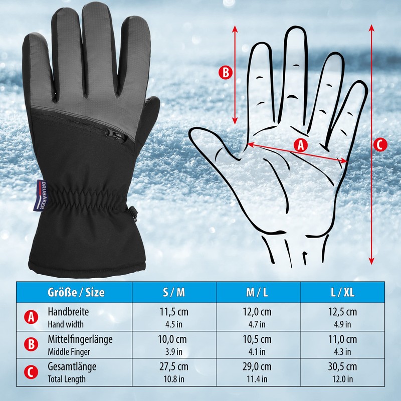 - For ski and snowboard: these winter sports gloves are versatile. They provide warm hands not only in ski areas. Even cyclists, motorcyclists and other outdoor athletes love these extra warm snowboard gloves from Brubaker. A must-have for your next ski holiday!