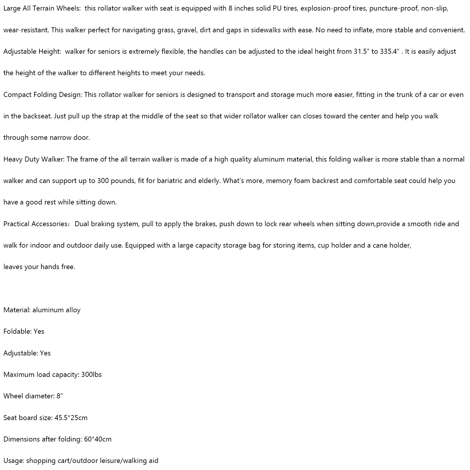 Heavy Duty Walker: The frame of the all terrain walker is made of a high quality aluminum material, this folding walker is more stable than a normal walker and can support up to 300 pounds, fit for bariatric and elderly. What’s more, memory foam backrest and comfortable seat could help you have a good rest while sitting down.