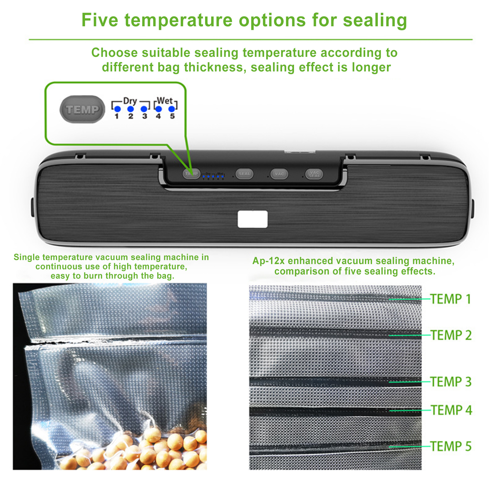 5: 5 kinds of sealing temperature options: According to different thickness of plastic bags or continuous sealing density,