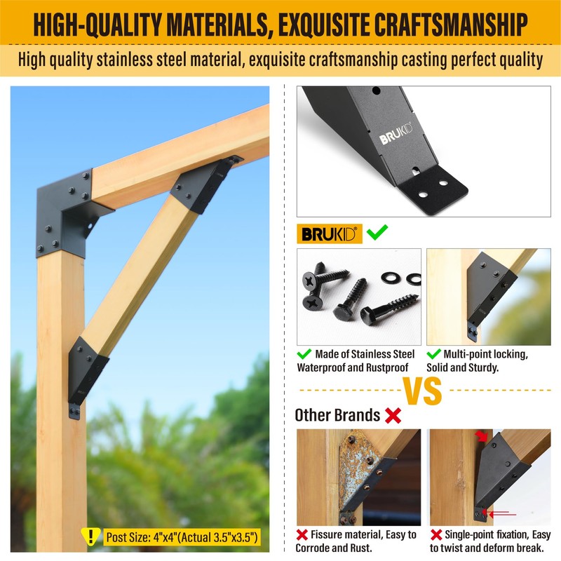 • SIMPLE INSTALLATION: The set includes all screw accessories and installation instructions, Bracket and screws are made of high quality stainless steel. You just need to plan your support size according to the installation instructions, Install the bracket on the crossbeam and vertical post, Cut the wooden beams to snap in, And lock the screws respectively, then the installation can be completed