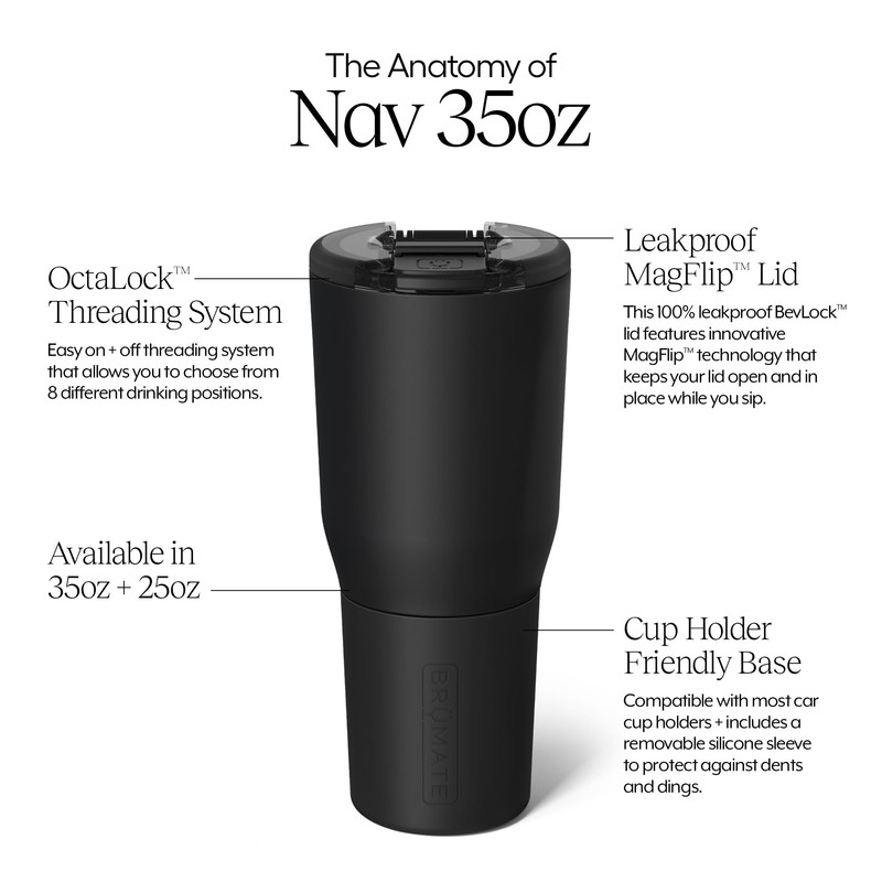 - FULLY LEAKPROOF & CUP-HOLDER FRIENDLY: The BrüMate Nav is the only 35oz, 100% leakproof, travel friendly, insulated travel mug designed to keep your favorite hot, cold and carbonated beverages at the perfect temperature on the go.