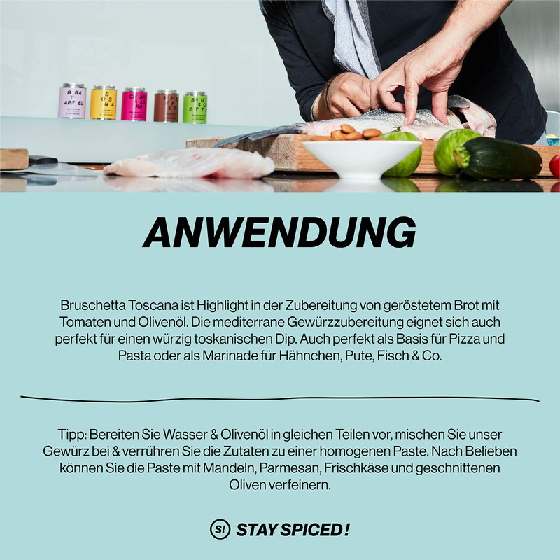 - The Mediterranean spice preparation is also perfect for a spicy Tuscan dip. Also perfect as a base for pizza and pasta or as a marinade for chicken, turkey, fish etc. Spiceworld tip: prepare water and olive oil in equal parts, mix the bruschetta spice and stir the ingredients into a homogeneous paste.