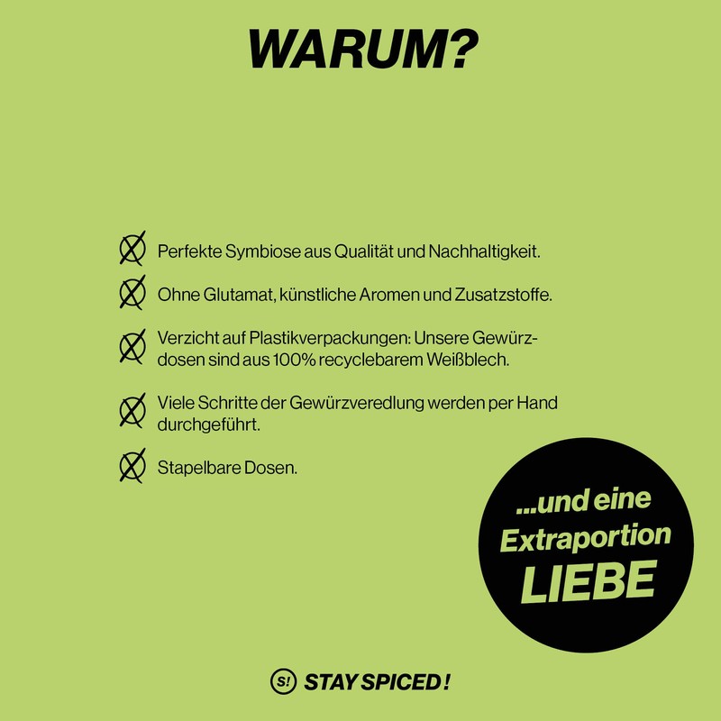 - Thanks to the high-quality production and selection of elegant spices and herbs, you will quickly notice that Stay Spiced! in the Champions League of the spice world. What are you waiting for? Become a member of our STAY SPICED family!