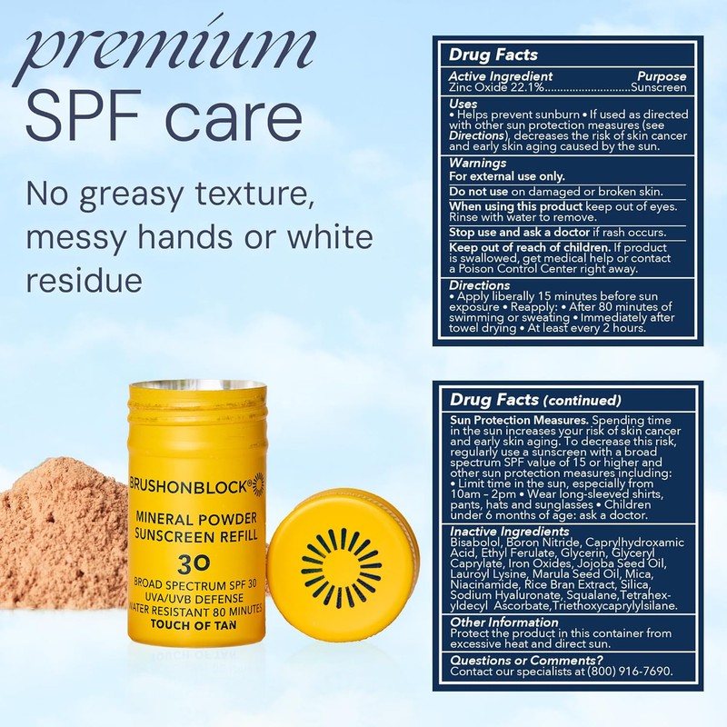 Brush On Block Brush On Block SPF 30 Mineral Powder Sunscreen Refill New Formula, With Niacinamide, Hyaluronic Acid, & Vitamin C, Broad Spectrum, Water Resistant, Reef Friendly (Touch of Tan Refill)