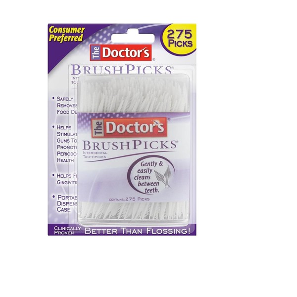 • Interdental Toothpicks Longer head with more bristles. Safely removes food debris. Stimulates gums to promote periodontal health. Fights gingivitis. Daily use of The Doctor's BrushPicks will produce a noticeable improvement in your oral health is just two weeks. 1. Improved with Plyalene for longer lasting bristles. 2. Extends between teeth gently and easily. 3. Brushes away debris. 4. Stimulates gums. 5. Will not harm dental and bridge work. 6. Maneuvers and is held easily. 7. Safely scrapes away plaque. Total of 250 toothpicks.