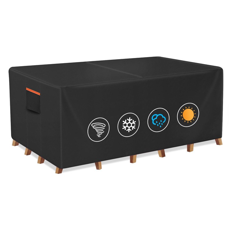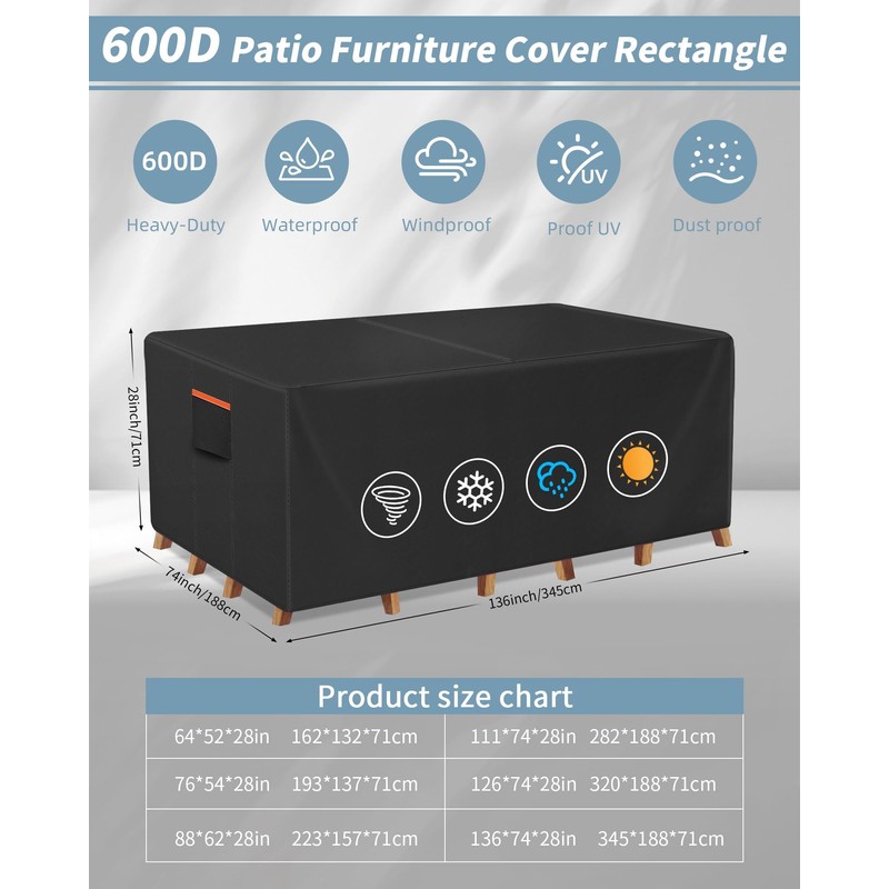 - WATERPROOF FURNITURE COVER DIMENSIONS: Extra-large coverage measuring sized at 136 inches wide, 74 inches long, and 28 inches high, to accommodate large rectangular patio tables and chairs furniture sets