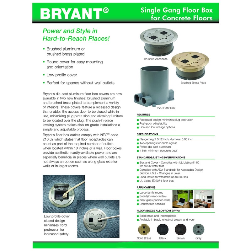 - Designed for slab-on-grade installation. Quick and easy installation is assured using a push in floor box leveling system