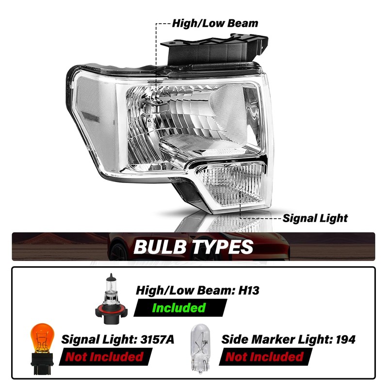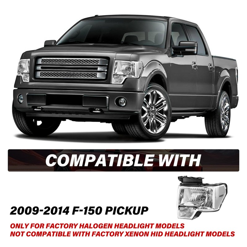 - 【VEHICLE COMPATIBILITY】Headlights Assembly Compatible with 2009 2010 2011 2012 2013 2014 Ford F-150 Pickup. Only for Factory Halogen Headlight Models. Not compatible with Factory Xenon HID Headlight Models. High / Low beam bulb type: H13 (included); Signal Light: 3157A (not included); Side Marker Light: 194 (not included). OEM Part Number#: DL3Z13008B, DL3Z13008A, DL3Z13008EB, DL3Z13008EC; Partslink Number#: FO2502287, FO2503287.