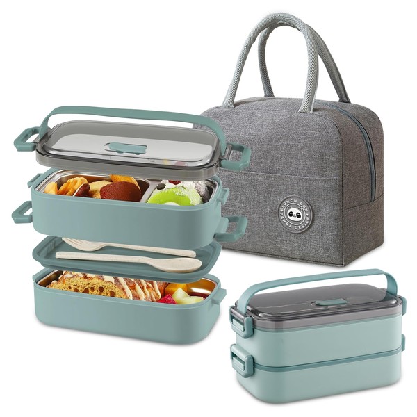 BRYN Brotdose mit Fächern, 1400ml Lunchbox + Besteck + Thermotasche, Bento Box für Picknick, Schule, Büros, Erwachsene, Kinder (Grün)